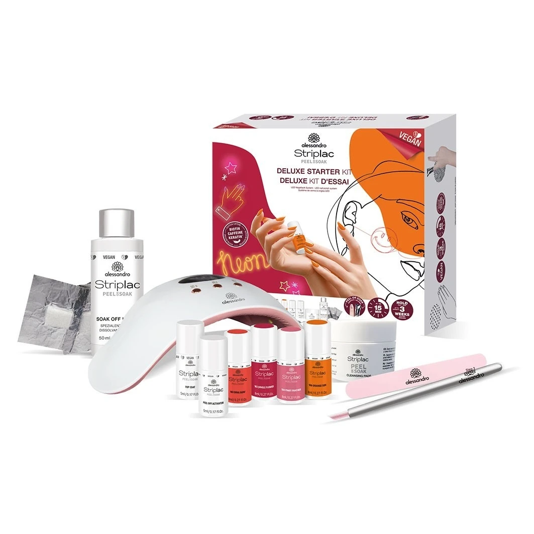 Verlang je naar een nagellak die lang blijft zitten, eruitziet als gel, thuis aangebracht en verwijderd kan worden en geen vervelende droogtijd heeft, dan hebben we een product met twee oplossingen – Striplac Peel of Soak! Makkelijk en snel aan te brengen met een perfect stralen tot de laatste dag! De Striplac Peel of Soak STARTER KIT DELUXE NEON bevat alle producten die nodig zijn voor een Striplac nagellak, waaronder drie Striplac Peel of Soak trendkleuren en een LED lamp voor het snel uitharden van de Striplac nagellak. • Gaat tot 3 weken mee• Gemakkelijk te gebruiken• Perfecte nagels in 15 minuten• Snelle peel-off OF losweken • VEGAN & Wreedheidsvrij