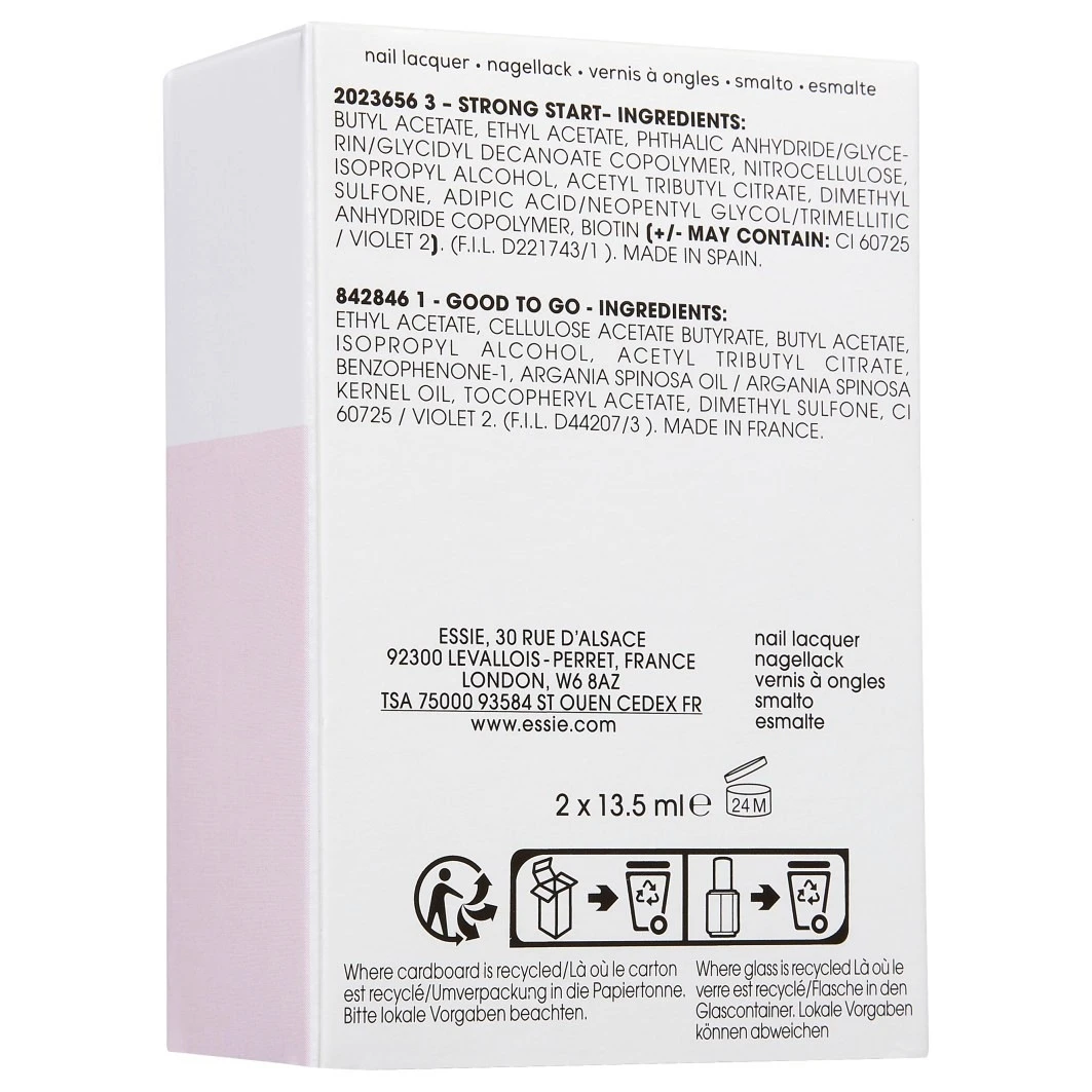 De essie Routine Set is de ideale startset voor het bereiken van optimale manicureresultaten. De versterkende base coat strong start bereidt de nagel optimaal voor op de kleur, die vervolgens wordt verzegeld door de hoogglanzende, sneldrogende topcoat good to go.